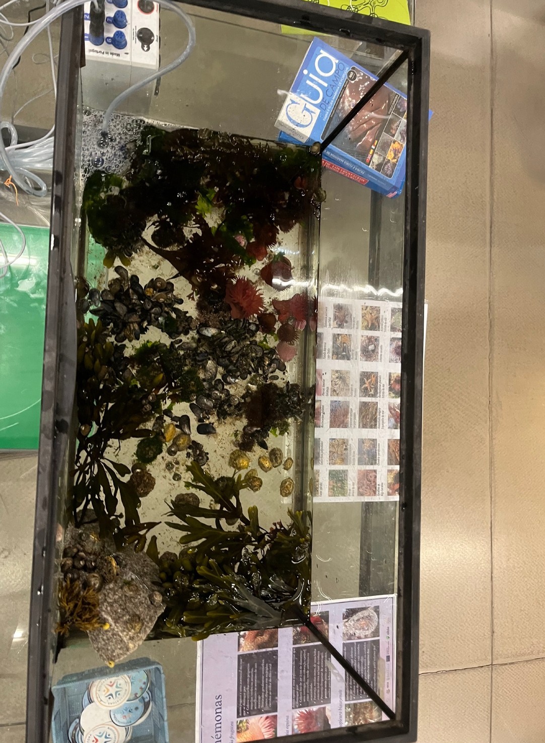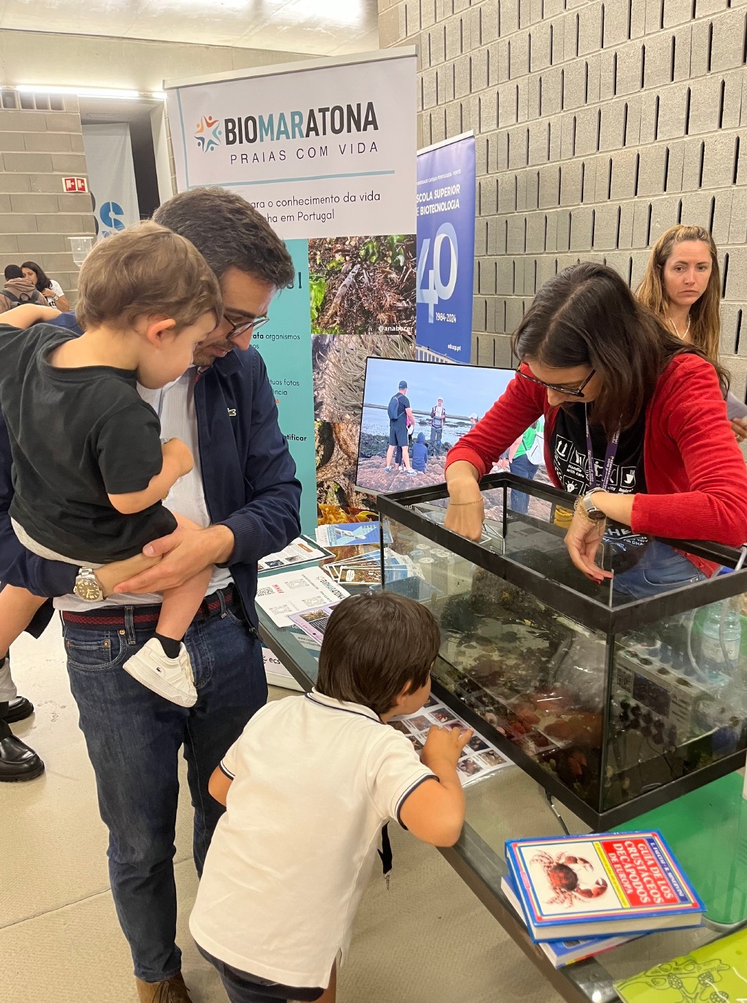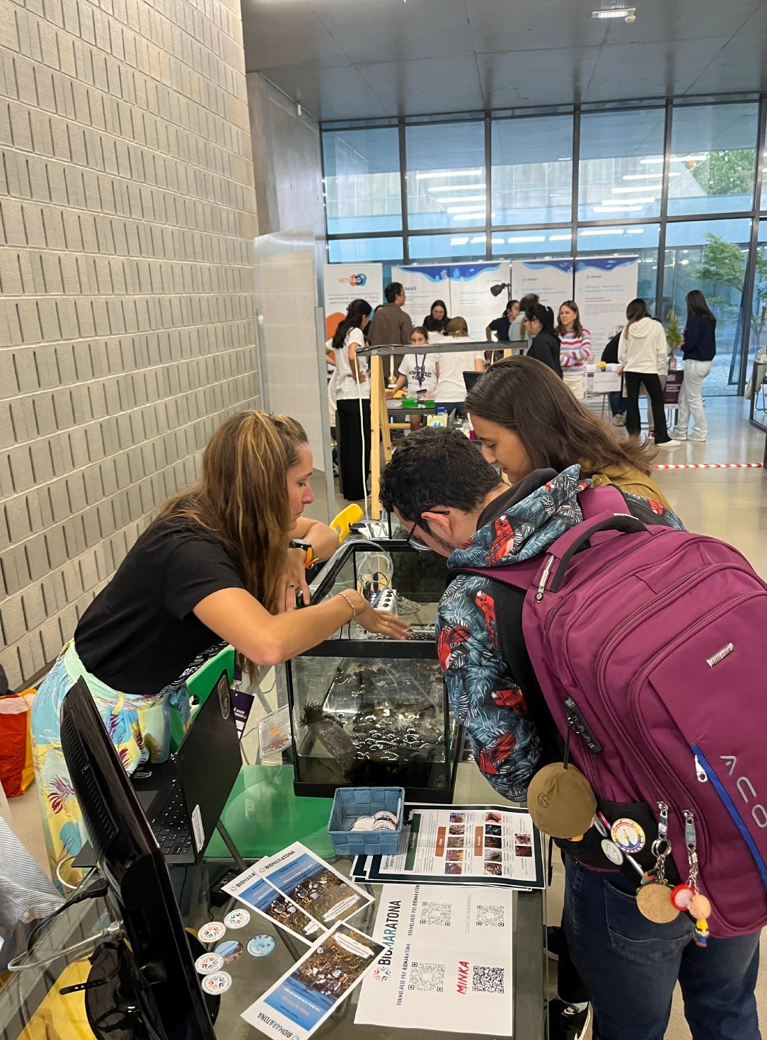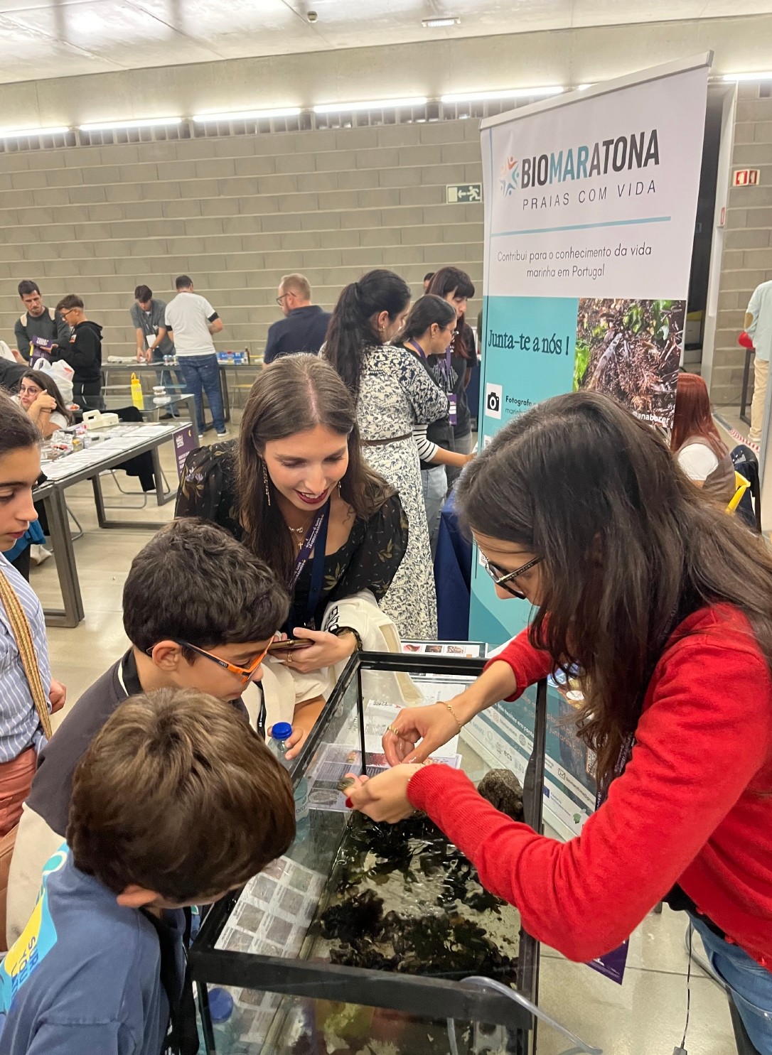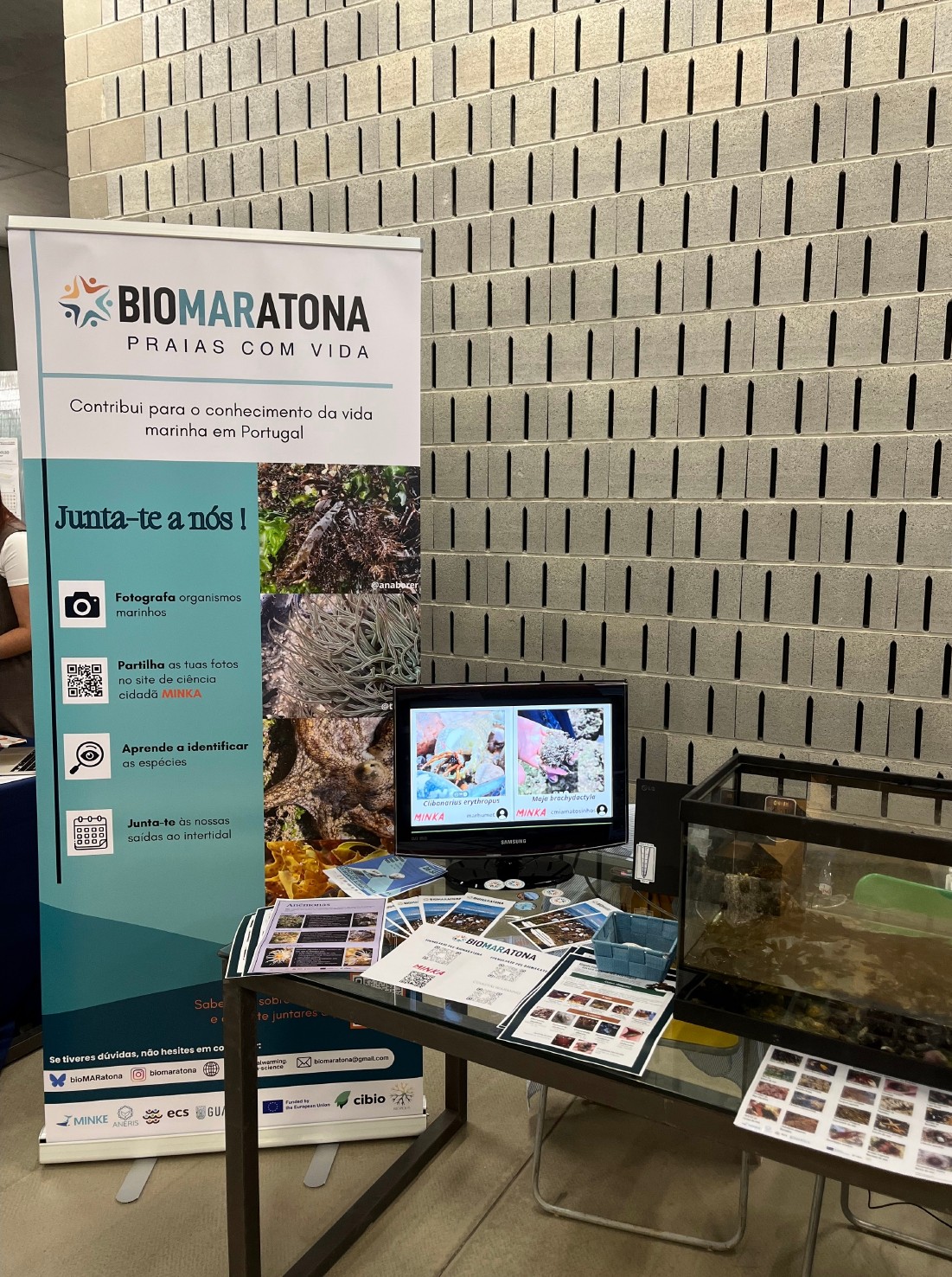 The workshop was divided in three parts, being a project presentation, a practical exercise with intertidal biodiversity aquariums and an interactive session, allowing participants to explore temperature sensors. The project presentation gave an overview of bioMARatona’s objectives, methodology, and results to date. During the intertidal biodiversity aquariums workshop, attendees were given the opportunity to get more familiar with living organisms collected from intertidal zones. To increase engagement, aquariums and tanks were placed, displaying the diversity of local algae species and animals. In addition, classification pamphlets and identification guides were distributed to participants in an attempt to let them classify the species. Finally, the last interactive session provided access to tanks equipped with temperature sensors, explaining how environmental variations and climatic alterations are recorded and studied. It also allowed participants to record and collect the temperature data themselves.