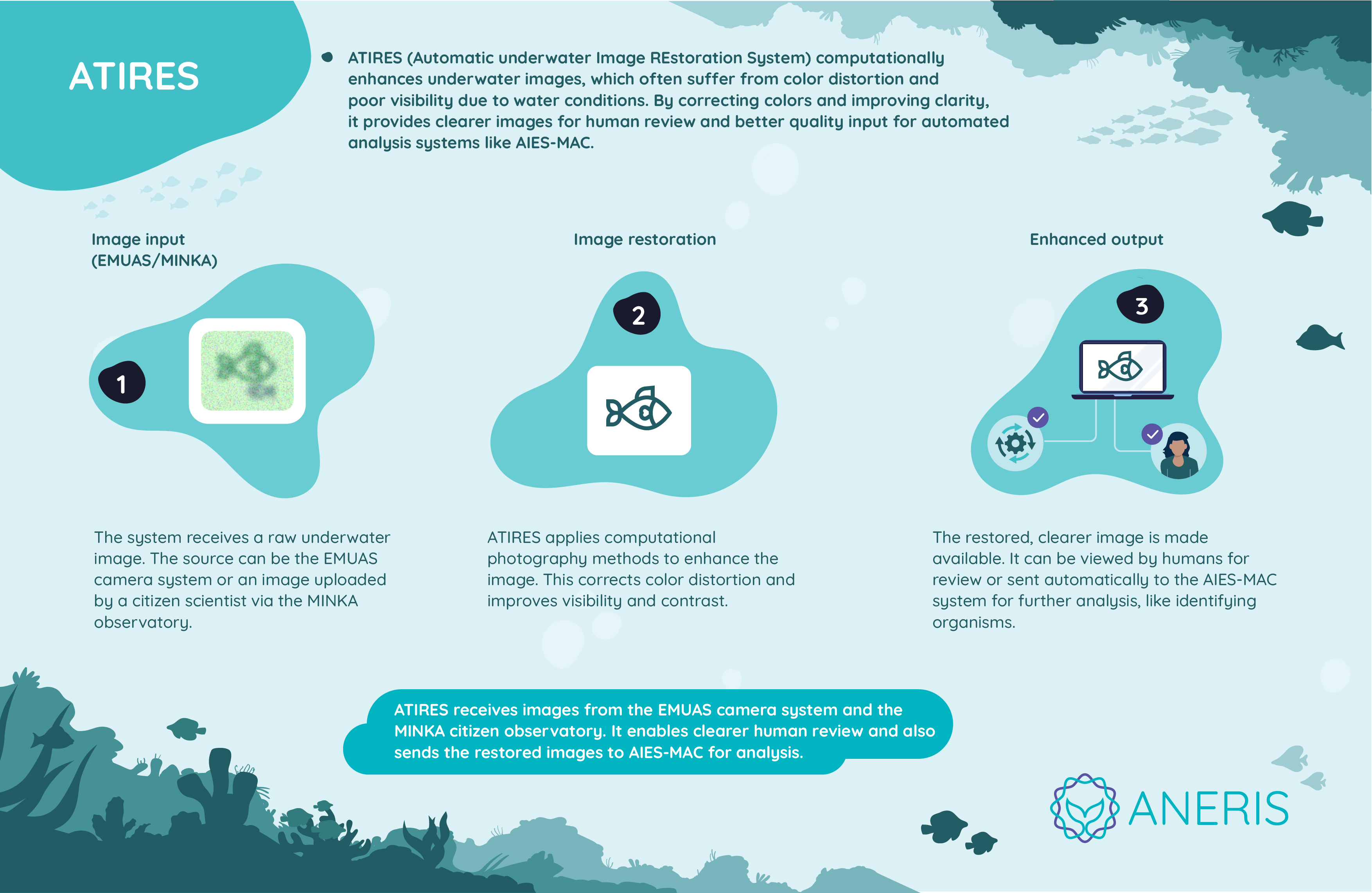 To improve image quality, ANERIS will develop computational photography methods for two sources: i) single underwater images captured by individuals using smartphones, and ii) images taken by multiple low-cost cameras connected together, utilizing information from various viewpoints. In both cases, the methods will include denoising, visibility enhancement, and color correction.
